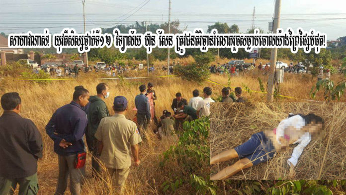 (រតនគិរី)៖ ហេតុការណ៍ភ្ញាក់ផ្អើលមួយ បានកើតឡើងដោយសារតែប្រទះឃើញ សពយុវតីសិស្សវិទ្យាល័យភូមិថ្មី ដេកស្លាប់ទាំងអក្រាតកាយ ក្នុងវាលស្មៅជាប់តូបលក់ចាប់ហួយ ស្ថិតក្នុងភូមិ៤ សង្កាត់កាចាញ ក្រុងបានលុង ខេត្តរតនគិរី។