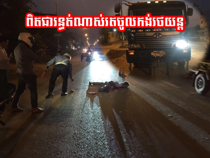 ម៉ាកHINOពណ៌ខៀវ ពាក់ផ្លាកលេខ ក្រុងព្រះសីហនុ3A.1168(អ្នកបើកបរមិនទាន់ស្គាល់អត្តសញ្ញាណគេចខ្លួន)បើកបរក្នងទិសដៅពីលិចទៅកើតមកដល់ចំណុចកើតហេតុខាងលើមានអ្នកថ្មើរជើងមួយនាក់(មិនទាន់ស្គាល់អត្តសញ្ញាណ)បានដើរក្នុងទិសដៅពីលិចទៅកើតមកដល់ចំណុចខាងលើអ្នកថ្មើរជើងក៏បានឈប់នៅកន្លែងកើតហេតុភ្លាមៗនោះអ្នកថ្មើរក៏បានរត់ចូលទៅក្រោមកង់រថយន្តផ្នែកខាងក្រោយចំហៀងខាងស្តាំបណ្តាលអោយស្លាប់ភ្លាមៗនៅកន្លែងកើតហេតុតែម្តង។ចំណែកសាកសពត្រូូវបានរថយន្តសង្គ្រោះរបស់ស្នងការខេត្តកណ្តាលដឹកយកទៅតម្កល់នៅសាលសពមន្ទីរពេទ្យបង្អែកជ័យជំនះដើម្បីរង់ចាំបងប្អូនមកទទួលយកទៅធ្វើបុណ្យតាមប្រពៃណី។រីឯររថយន្តត្រូវបានផ្នែកជំនាញយកទៅរក្សាទុកនៅអធិការដ្ឋាននគរបាលក្រុងតាខ្មៅដើម្បីកសាងសំណុំតាមនីតិវិធីច្បាប់។